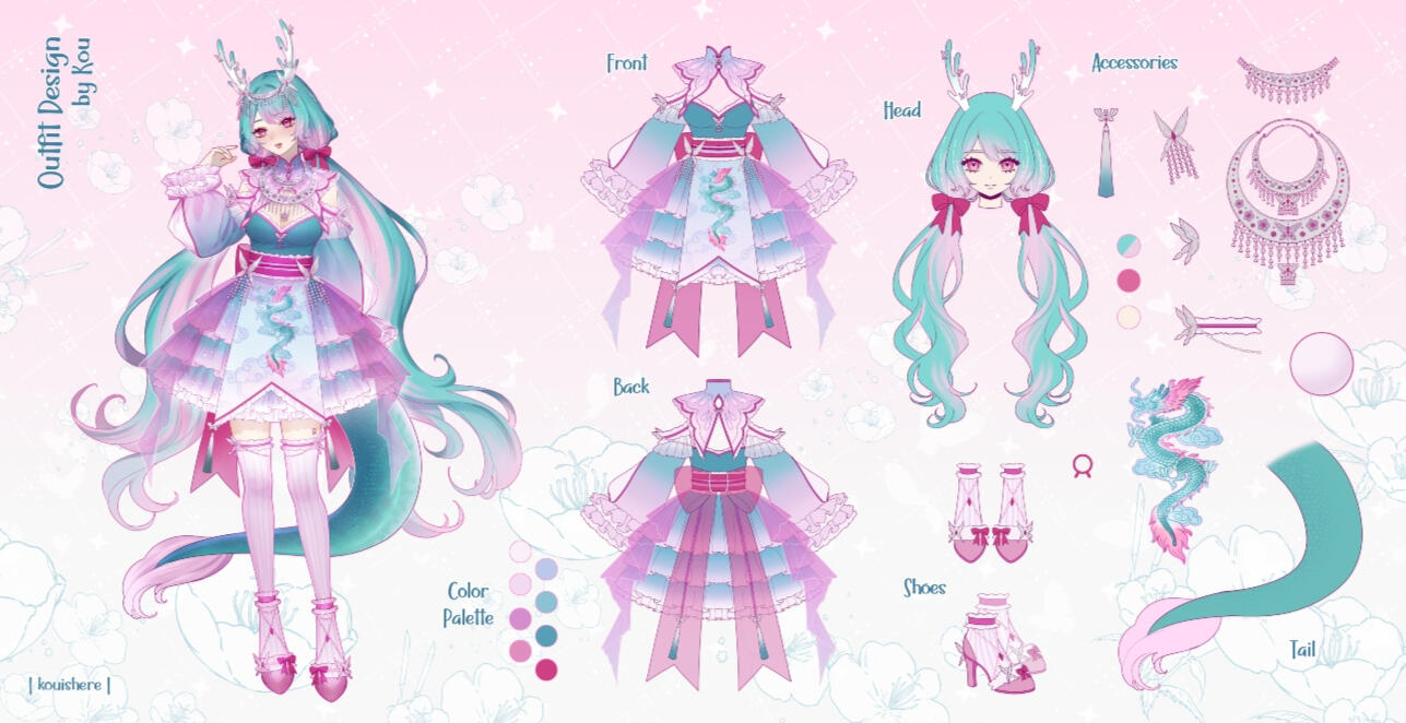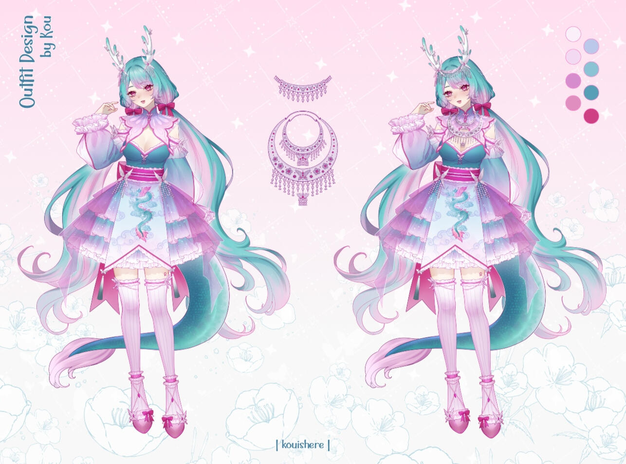 • often seen with: lotus flowers, Chinese dragons, a floating pearl (about size of her head), silver glowing butterflies, an orange tabby cat & a gray cat (her pets), with Dove (Vtuber, irl husband), & can be (optional) without silver necklace & head decoration
